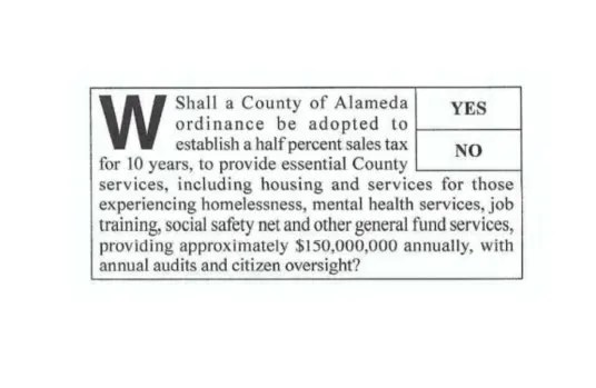 “Shall a County of Alameda ordinance be adopted to establish a half percent sales tax for 10 years, to provide essential County services, including housing and services for those experiencing homelessness, mental health services, job training, social safety net and other general fund services, providing approximately $150,000,000 annually, with annual audits and citizen oversight?”